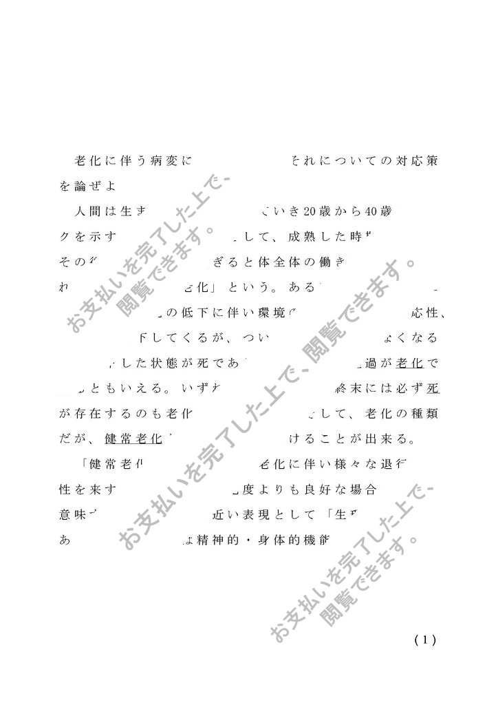 通信教育のレポートです。あくまで参考にお願いします。一部変えただけや、そのまま写したりは、違反になり処罰の対象となります。老化に伴う病変について示し、それについての対応策について述べています。老化に伴う病変について示し、それについての対応策を述べています。