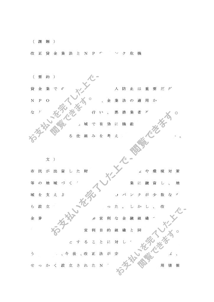 市民が出資した財源を、地域福祉や環境対策等の地域づくりにかかわる事業に融資し、地域を支えようとするNPOバンクが少数ながら設立されるようになった。しかし、改正貸金業法によって、非営利な金融組織であるにもかかわらず、営利目的組織と同様に画一的に規制対象とすることに対して私は残念に思うと共に、今後、改正法が完全施行されれば、せっかく設立...