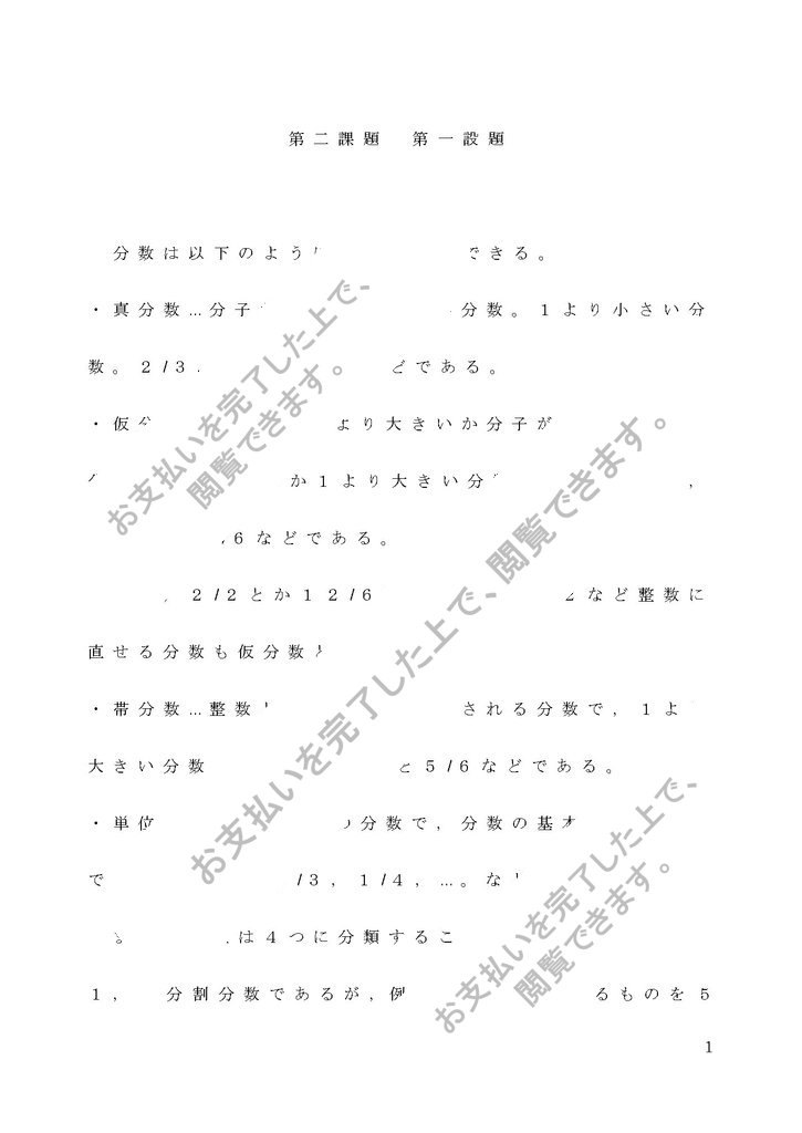 ・真分数…分子が分母より小さい分数。1より小さい分数。2/3,5/6,4/9などである。 ・仮分数…分子が分母より大きいか分子が分母と等しい分数。1と等しいか1より大きい分数。3/2,7/3,2/2,12/6などである。 また,2/2とか12/6のように,1や2など整数に直せる分数も仮分数という。 ・帯分数…整数と真分数の和で表される分数で,1より大きい分数。1と1/2,3と5/6などである。 ・単位分数…分子が1の分数で,分数の基本となる単位である。1/2,1/3,1/4,…。などである。