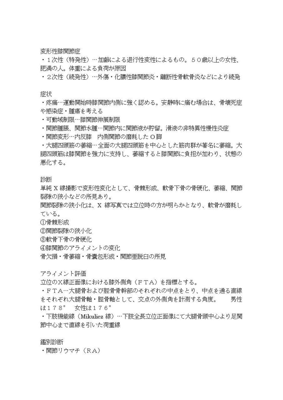 ・疼痛…運動開始時膝関節内側に強く認める。安静時に痛む場合は、骨壊死症や感染症・腫瘍を考える