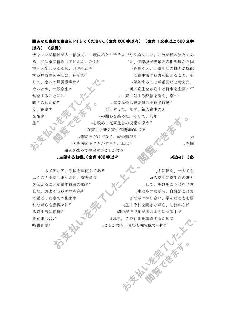チャレンジ精神が人一倍強く、一度決めたら最後までやりぬくこと。これが私の強みである。私は寮に暮らしていたが、新しい寮に移住した結果、住環境が先輩との相部屋から個室へと変わったため、共同生活を通じて濃密な人間関係を築くという寮生活の魅力が風化する危険性を感じた。以前の寮生活を知らない新入寮生に寮生活の魅力を伝えること、そして、寮への帰属意識が次第に薄れてきている在寮生へ対処することが重要だと考えた。そのため、一般寮生の立場から寮委員長に立候補し、新入寮生を歓迎する行事を企画・運営をすることにし...