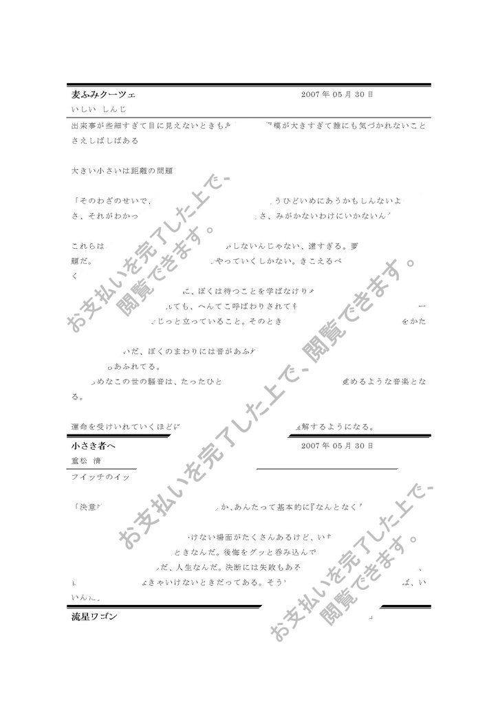 麦ふみクーツェ 2007年05月30日 いしい しんじ 出来事が些細すぎて目に見えないときもある。また規模が大きすぎて誰にも気づかれないことさえしばしばある 大きい小さいは距離の問題 「そのわざのせいで、よけいめだっちゃって、いっそうひどいめにあうかもしんないよ。でもさ、それがわかっててもさ、へんてこは、わざをさ、みがかないわけにいかないんだよ。」 これらは、今のぼくにはきこえない。音がしないんじゃない、遠すぎる。要するに、距離の問題だ。ひとははじめからきこえる音でやっていくしかない。きこえるべきものは、そのときがくればちゃんと耳にとどく。 熟練のティンパニ奏者のように、ぼくは待つことを学ばなけりゃならない。それはなかなかにむずかしい。ばかといわれても、へんてこ呼ばわりされても、けっしてばちを捨てず、ステージのいちばんうしろでじっと立っていること。そのときをきき逃さぬよう、ちゃんと耳をかたむけて。 ずっと長いあいだ、ぼくのまわりには音があふれてた。 ぞして今もあふれてる。 でたらめなこの世の騒音は、たったひとつのリズムがきっかけで、目の覚めるような音楽となる。 運命を受けいれていくほど...
