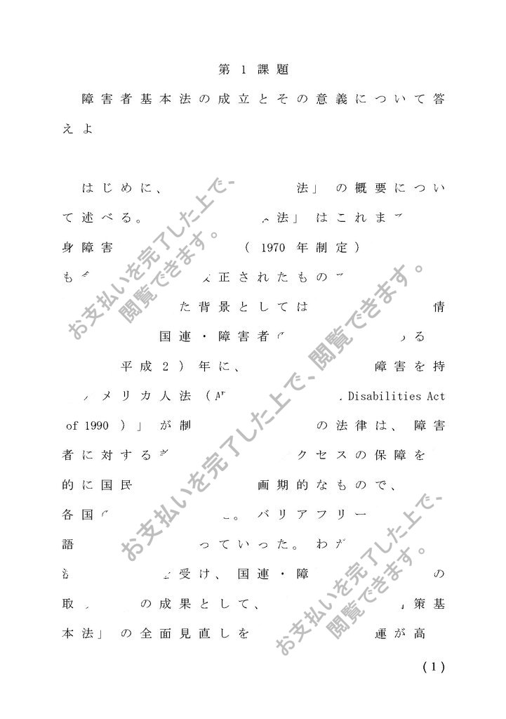 通信教育のレポートです。あくまで参考にお願いします。一部変えただけや、そのまま写したりは、違反になり処罰の対象となります。精神保健福祉論1(障害者基本法の成立とその意義について述べています。)