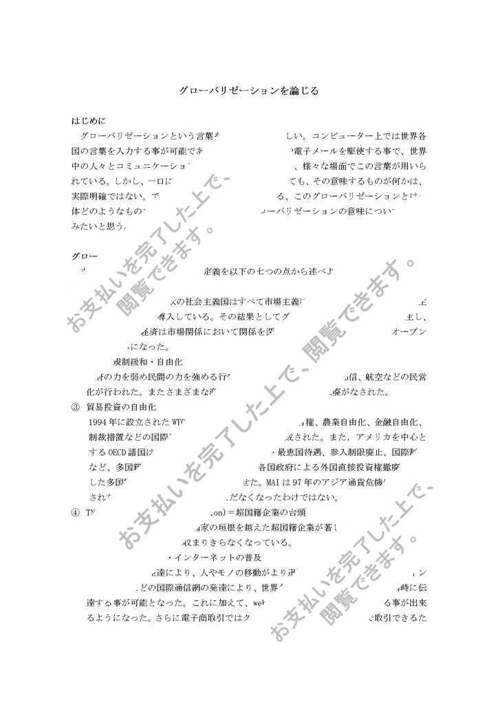 グローバリゼーションという言葉を耳にしてもう久しい。コンピューター上では世界各国の言葉を入力する事が可能であり、インターネットや電子メールを駆使する事で、世界中の人々とコミュニケーションをとる事が出来る。いま、様々な場面でこの言葉が用いられている。しかし、一口にグローバリゼーションといっても、その意味するものが何かは、実際明確ではない。ではわれわれが普段耳にしている、このグローバリゼーションとは一体どのようなものであるのだろうか。以下でグローバリゼーションの意味について論じてみたいと思う。