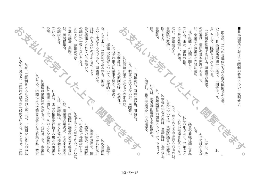 ■日本国憲法における二院制の特徴について説明せよ
