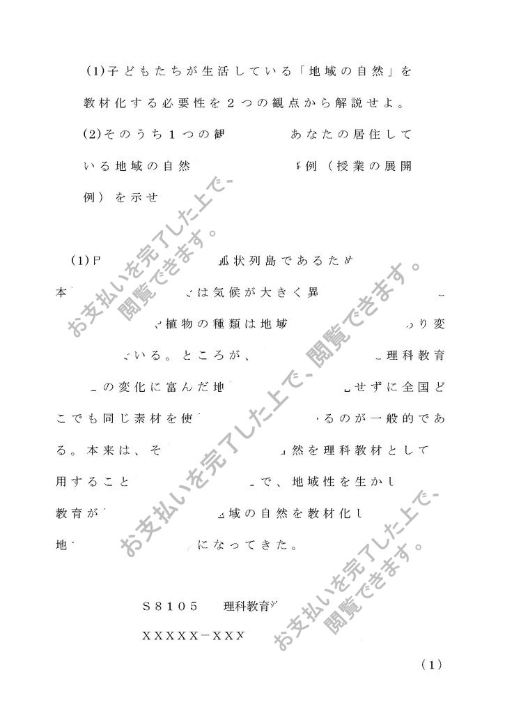 (1)子どもたちが生活している「地域の自然」を教材化する必要性を2つの観点から解説せよ。 (2)そのうち1つの観点から、あなたの居住している地域の自然を教材化した事例(授業の展開例)を示せ。