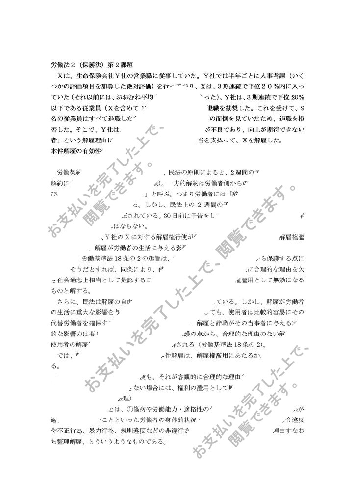 Xは、生命保険会社Y社の営業職に従事していた。Y社では半年ごとに人事考課(いくつかの評価項目を加算した絶対評価)を行っており、Xは、3期連続で下位20%内に入っていた(それ以前には、おおむね平均より少し上位であった)。Y社は、3期連続で下位20%以下である従業員(Xを含めて10人が該当)に対し、退職を勧奨した。これを受けて、9名の従業員はすべて退職したが、Xは、高齢である両親の面倒を見ていたため、退職を拒否した。そこで、Y社は、就業規則20条の「勤務成績が不良であり、向上が期待できない者」という解雇理由に基づき、30日分の解雇予告手当を支払って、Xを解雇した。