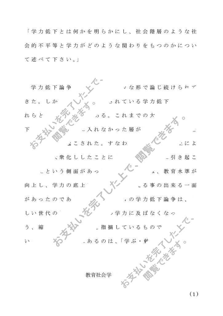 S0106 教育社会学 第2設題「学力低下とは何かを明らかにし、社会階層のような社会的不平等と学力がどのような関わりをもつのかについて述べて下さい。」