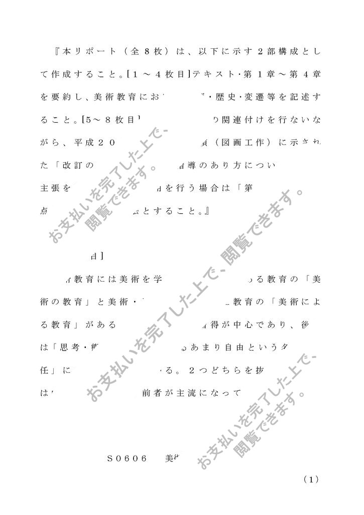 『本リポート(全8枚)は、以下に示す2部構成として作成すること。[1~4枚目]テキスト・第1章~第4章を要約し、美術教育における問題・歴史・変遷等を記述すること。[5~8枚目]上記の要約との関連付けを行ないながら、平成20年版学習指導要領(図画工作)に示された「改訂の要点」に沿った指導のあり方について自身の主張を述べること。引用を行う場合は「第1設題の留意点」に示された方法とすること。』