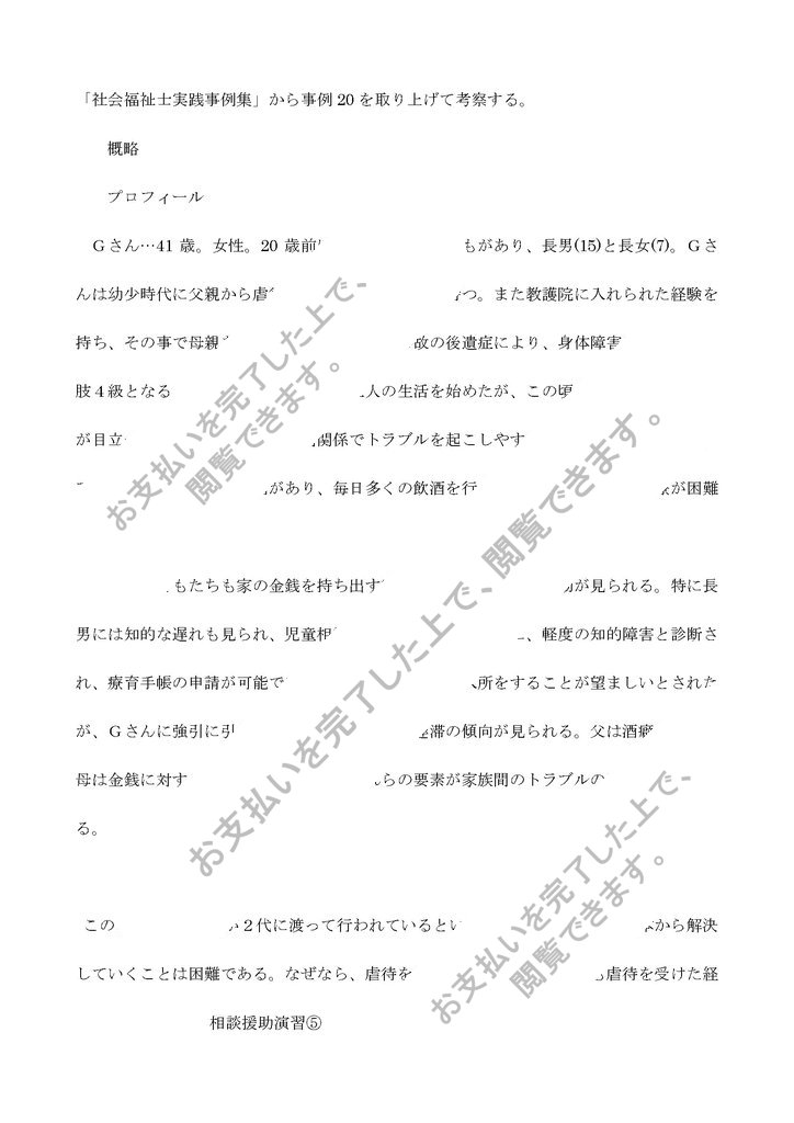 Gさん…41歳。女性。20歳前に結婚し二人の子どもがあり、長男(15)と長女(7)。Gさんは幼少時代に父親から虐待を受けて育った過去を持つ。また教護院に入れられた経験を持ち、その事で母親を憎んでいる。自殺未遂事故の後遺症により、身体障害者手帳の上下肢4級となる。父母の住む隣町で親子三人の生活を始めたが、この頃から子どもへの虐待が目立つようになる。また、人間関係でトラブルを起こしやすく転職を繰り返している。アルコールに依存する傾向があり、毎日多くの飲酒を行うため、肝炎に対する治療が困難となっている。