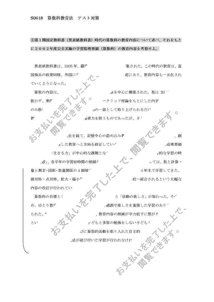 ①第1期国定教科書(黒表紙教科書)時代の算数科の教育内容について述べ、それをもとに2002年度完全実施の学習指導要領(算数科)の教育内容を考察せよ。