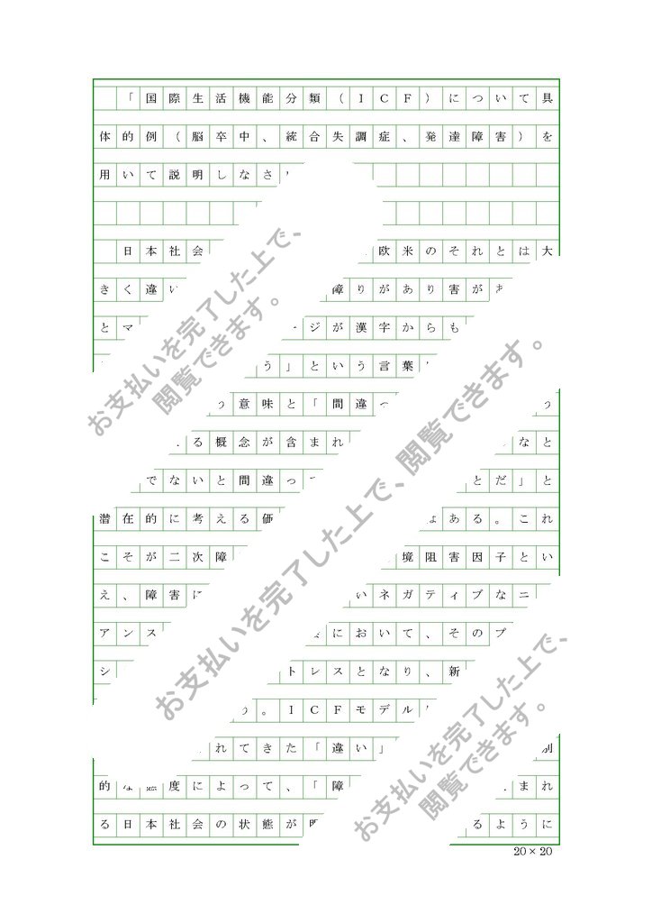 「国際生活機能分類(ICF)について具体的例(脳卒中、統合失調症、発達障害)を用いて説明しなさい。