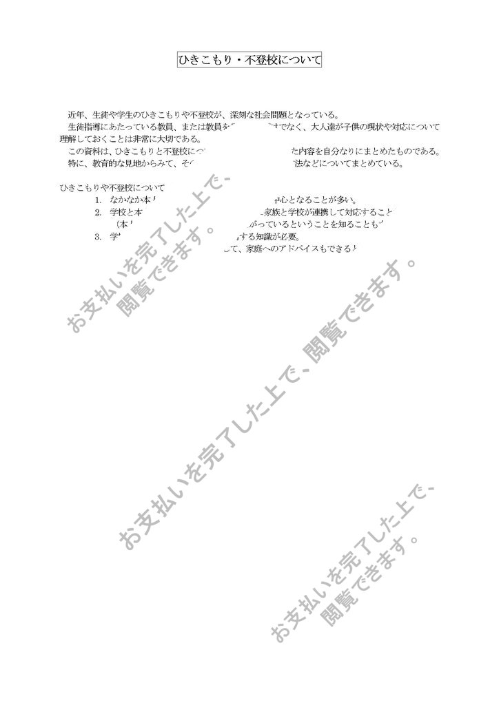 この資料は、ひきこもりと不登校について、講義や研修を受けた内容を自分なりにまとめたものである。特に、教育的な見地からみて、その特性や特徴、原因、対応方法などについてまとめている。