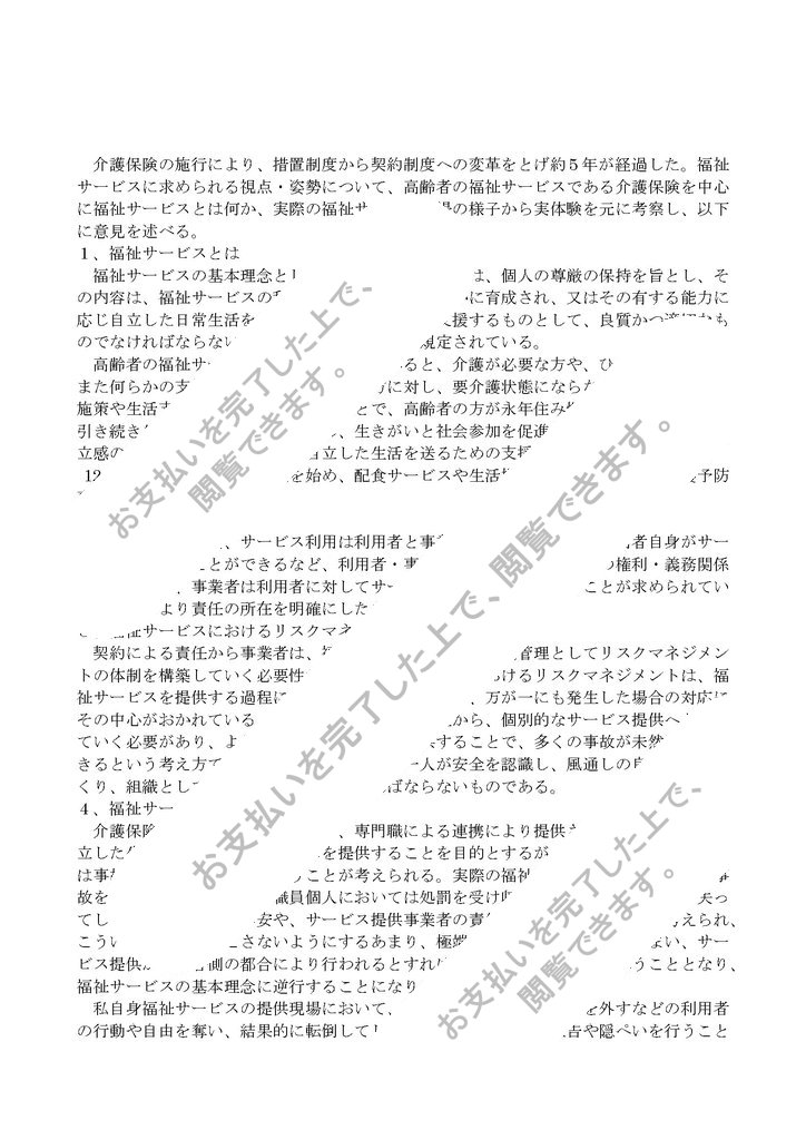 介護保険の施行により、措置制度から契約制度への変革をとげ約5年が経過した。福祉サービスに求められる視点・姿勢について、高齢者の福祉サービスである介護保険を中心に福祉サービスとは何か、実際の福祉サービス現場の様子から実体験を元に考察し、以下に意見を述べる。