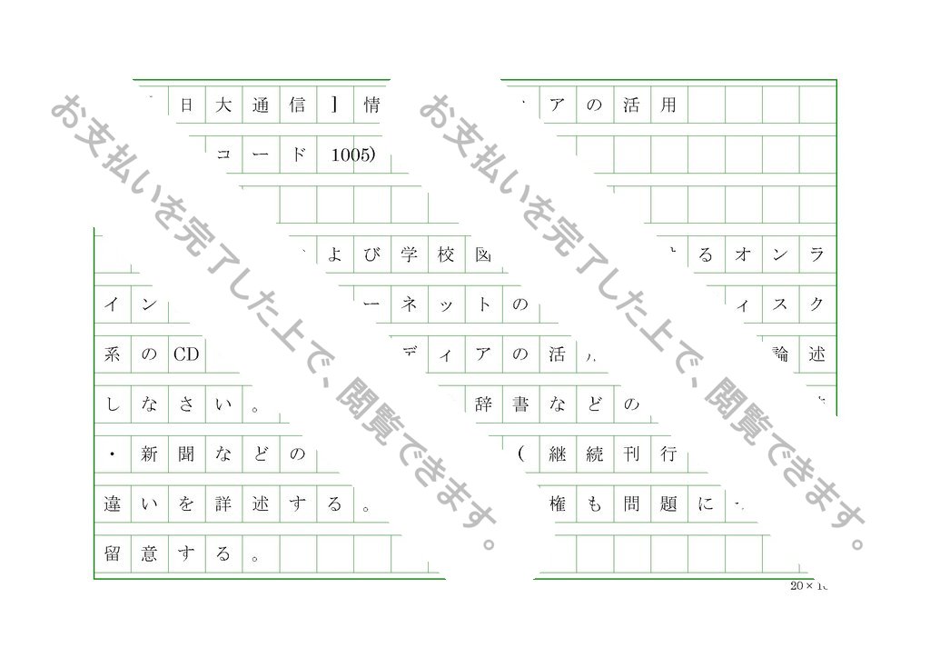 日本大学通信教育部の「情報メディアの活用」のレポートです。学校図書館司書教諭では必須科目のうちの1科目で、一発合格しました。レポート作成、テスト対策にお役立て下さい。