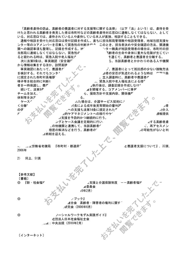 社会福祉士養成通信過程のレポートです。高齢者虐待への具体的な対応方法について説明しています。400字(20×20)3ページ分です。 採点では、「優」をいただいたレポートです。引用・参考文献付き。