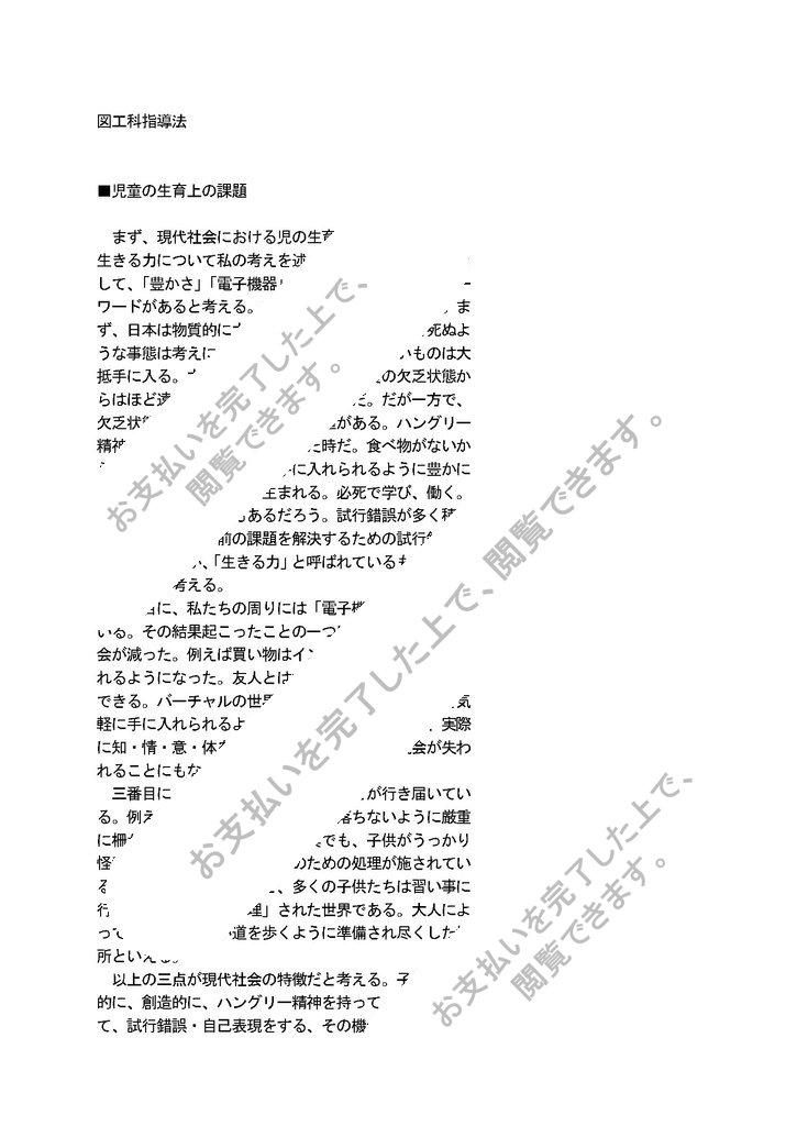 まず、現代社会における児の生育上の課題をふまえ、生きる力について私の考えを述べる。現代社会の特徴として、「豊かさ」「電子機器」「管理」という3つのキーワードがあると考える。それぞれについて説明する。まず、日本は物質的に大変「豊か」である。飢えて死ぬような事態は考えにくい。お金を出せば、欲しいものは大抵手に入る。大戦前後にあったような物質の欠乏状態からはほど遠い。それは素晴らしいことだ。だが一方で、欠乏状態だからこそ感じられる価値がある。ハングリー精神が湧き起こるのも、そうした時だ。食べ物がないからこそ、食べ物をいつでも手に入れられるように豊かになりたいと願い、行動が生まれる。必死で学び、働く。行動をすれば、失敗もあるだろう。試行錯誤が多く積み上げられる。目の前の課題を解決するための試行錯誤。私はこれこそが、「生きる力」と呼ばれているものの一つの本質だと考える。