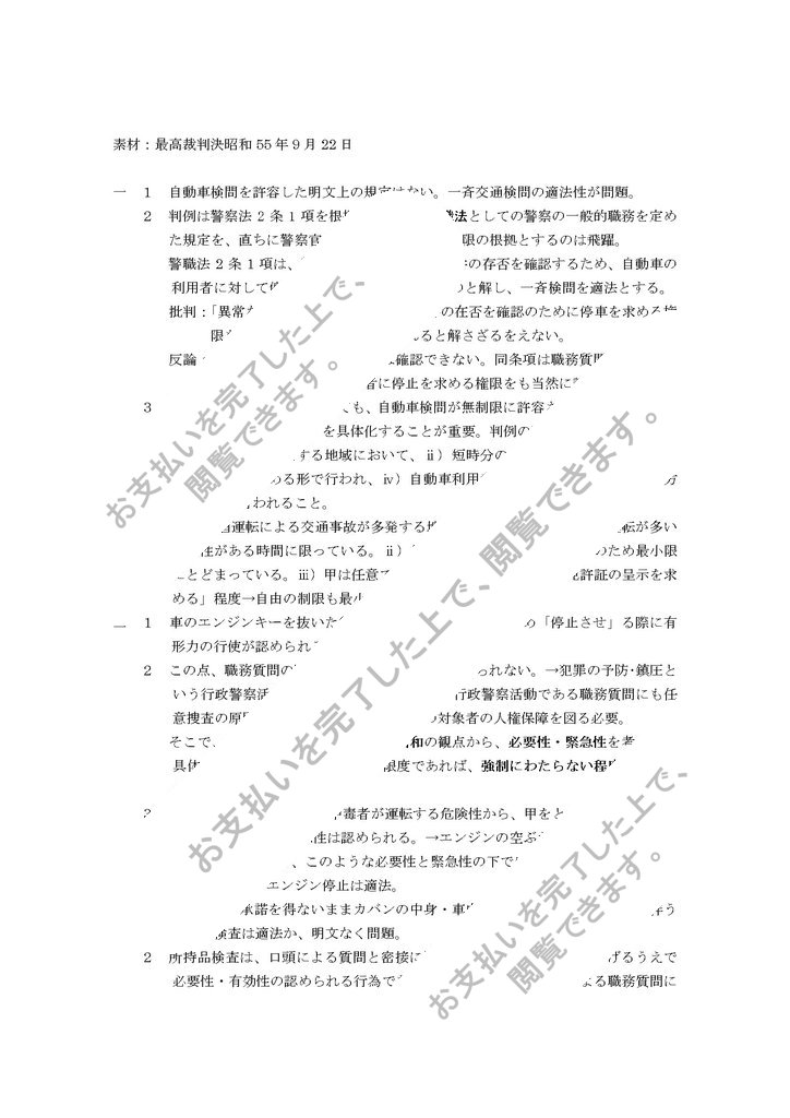 2 判例は警察法2条1項を根拠。しかし、組織法としての警察の一般的職務を定めた規定を、直ちに警察官の行使する具体的な権限の根拠とするのは飛躍。警職法2条1項は、警察官に、職務質問の要件の存否を確認するため、自動車の利用者に対して停止を求める権限を与えたものと解し、一斉検問を適法とする。