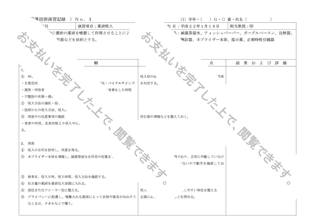 〈 看護技術演習記録 〉No.1 (1)学年・( )G・()番・氏名( )