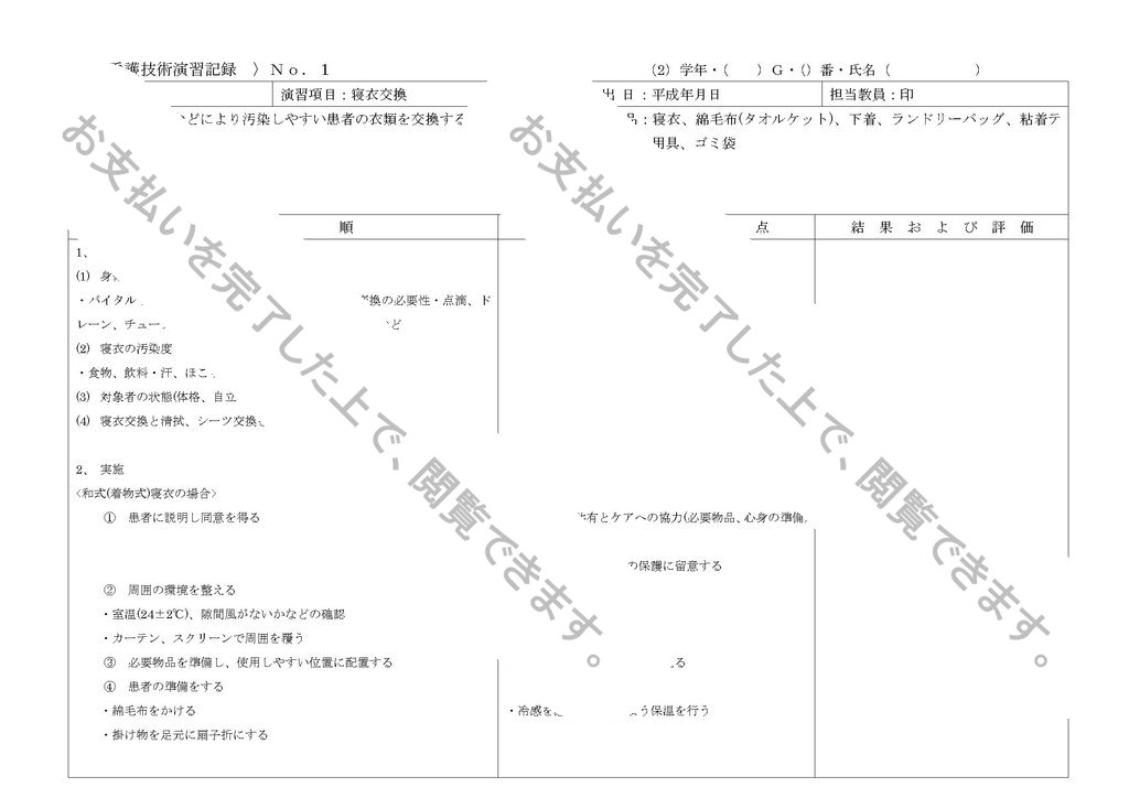 〈 看護技術演習記録 〉No.1 (2)学年・( )G・()番・氏名( )