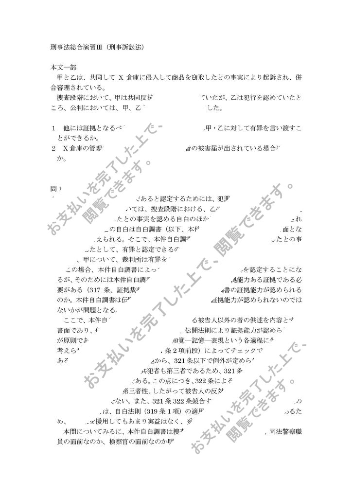 1 裁判所が、被告人は有罪であると認定するためには、犯罪の証明がなければならない(336条)。本件においては、捜査段階における、乙の、甲と共同してX倉庫に侵入して商品を窃取したとの事実を認める自白のほかに証拠となるものはないとされている。なお、この自白は自白調書(以下、本件自白調書とする。)として書面となっていると考えられる。そこで、本件自白調書のみで、甲・乙が犯行を犯したとの事実を証明したとして、有罪と認定できるのか、以下検討する。