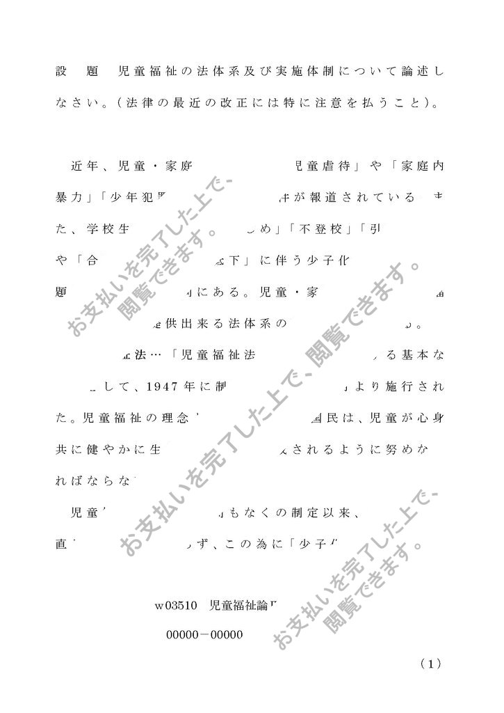 設 題 児童福祉の法体系及び実施体制について論述しなさい。(法律の最近の改正には特に注意を払うこと)。