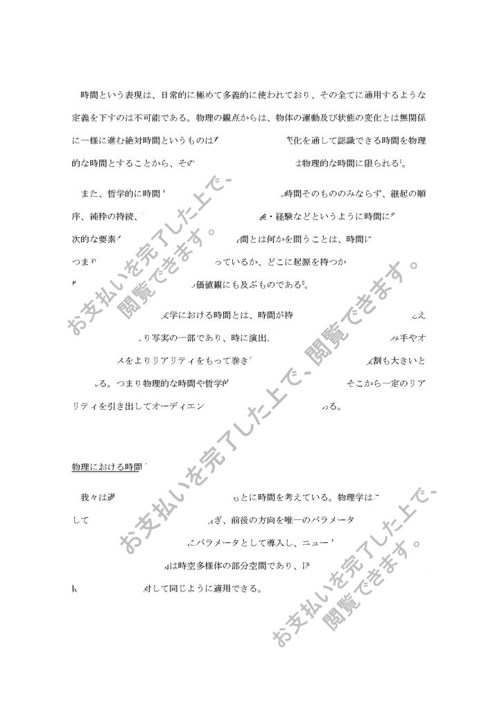 単位を取得済みの合格レポートです。時間という表現は、日常的に極めて多義的に使われており、その全てに通用するような定義を下すのは不可能である。物理の観点からは、物体の運動及び状態の変化とは無関係に一様に進む絶対時間というものは存在せず、物体の変化を通して認識できる時間を物理的な時間とすることから、その存在を確認できる時間とは物理的な時間に限られる 。