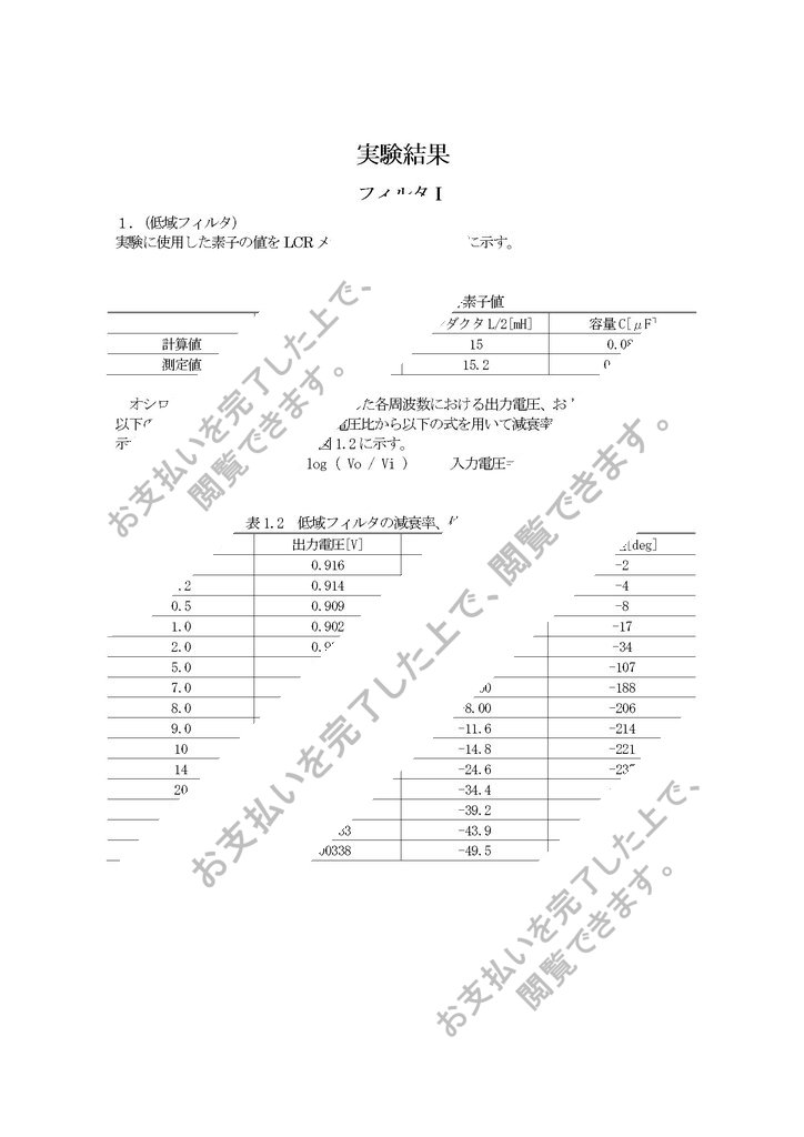 実験結果1と同様に測定した出力電圧、波形の位相差と測定値より求めた減衰率を表1.4に示す。減衰率を図1....