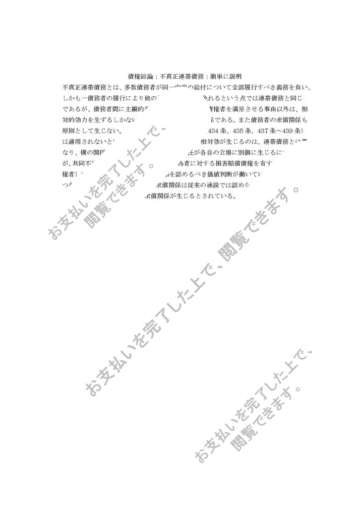 不真正連帯債務とは、多数債務者が同一内容の給付について全部履行すべき義務を負い、しかも一債務者の履行により他の債務者も債務を免れるという点では連帯債務と同じであるが、債務者間に主観的共同関係がないため、債権者を満足させる事由以外は、相対的効力を生ずるしかないと構成される債権債務関係である。また債務者の求償関係も原則として生じない。すなわち、連帯債務の規定(434条、435条、437条~439条)は適用されないということである。このように、相対効が生じるのは、連帯債務とは異なり、横の関係と主観的共同関係がなく、責任が各自の立場に別個に生じるにすぎないが、共...