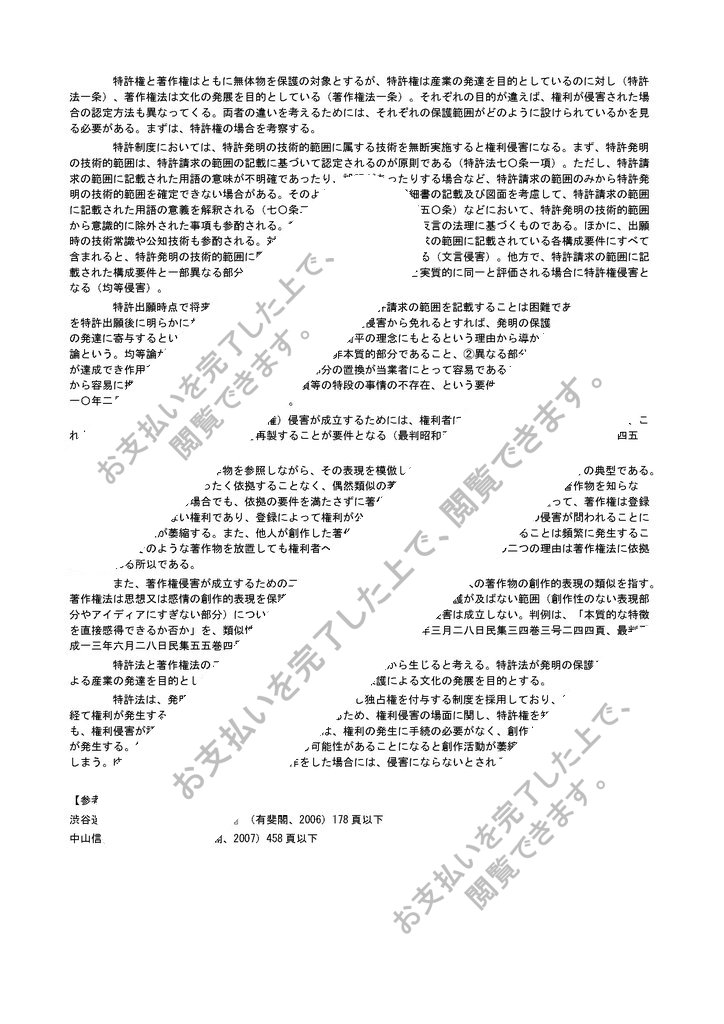 特許権と著作権はともに無体物を保護の対象とするが、特許権は産業の発達を目的としているのに対し(特許法一条)、著作権法は文化の発展を目的としている(著作権法一条)。それぞれの目的が違えば、権利が侵害された場合の認定方法も異なってくる。両者の違いを考えるためには、それぞれの保護範囲がどのように設けられているかを見る必要がある。まずは、特許権の場合を考察する。
