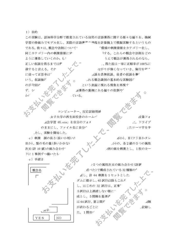 この実験は、認知科学分野で提案されている幼児の言語獲得に関する様々な偏りを、機械学習の枠組みでモデル化し、実際の言語獲得の過程を計算機上で模擬実験するというものである。我々は、概念や法則についての知識に基づいて環境の刺激情報をカテゴリー化し、同じカテゴリー内の刺激情報に対しては同じ反応を適用する。これらの概念や法則をどのように獲得していくのか。もし、ある仮説を検討していくうえで概念が獲得されるのなら、正しい仮説を得るまでは偶然による正答しか起こらなく、得た後は一挙に正解率が100%に達すると言える。それとも、精神内部で諸要素のつながりが強くなっていき、施行を経るに従って正答率は徐々に高くなるのか。前者の仮説を悉無仮説、後者の仮説を漸増仮説という。仮説検証過程の分析などによく用いられる概念識別の基本的な実験図示を実習するのが今回の実験の目的である。言語獲得という表面に現れる現象を再現するだけに留まらず,シミュレーションを通じて,言語獲得の裏側にある偏りの役割や偏り間の関係も明らかにすることを最終的な目標としている。