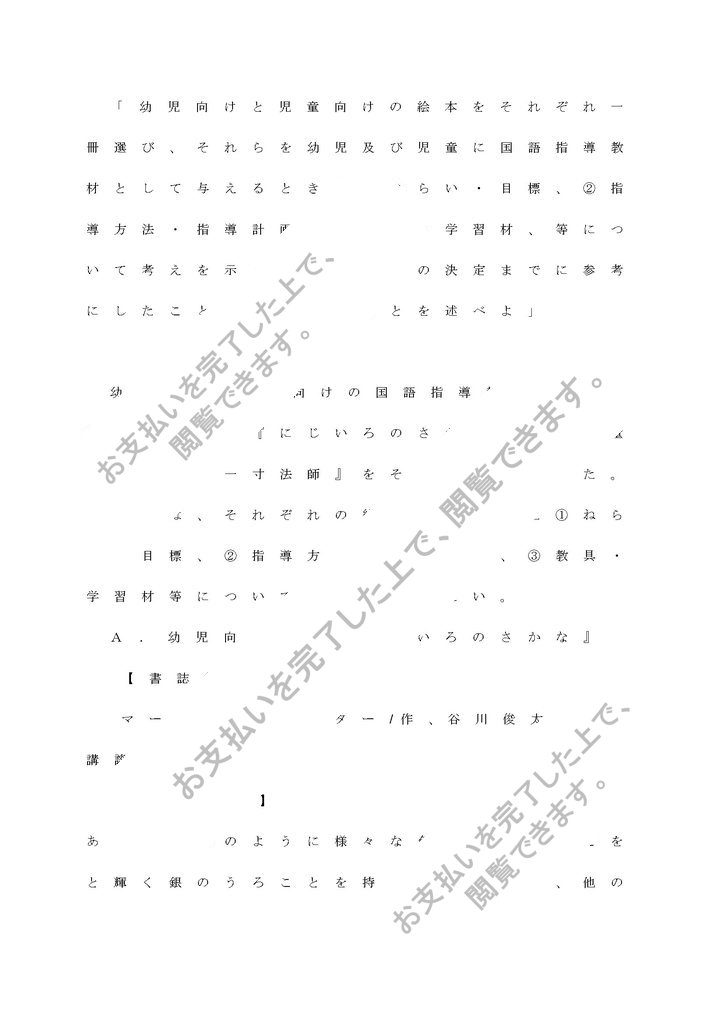 「幼児向けと児童向けの絵本をそれぞれ一冊選び、それらを幼児及び児童に国語指導教材として与えるときの①ねらい・目標、②指導方法・指導計画、③教具・学習材、等について考えを示すと共に、その決定までに参考にしたことや思索したことを述べよ」