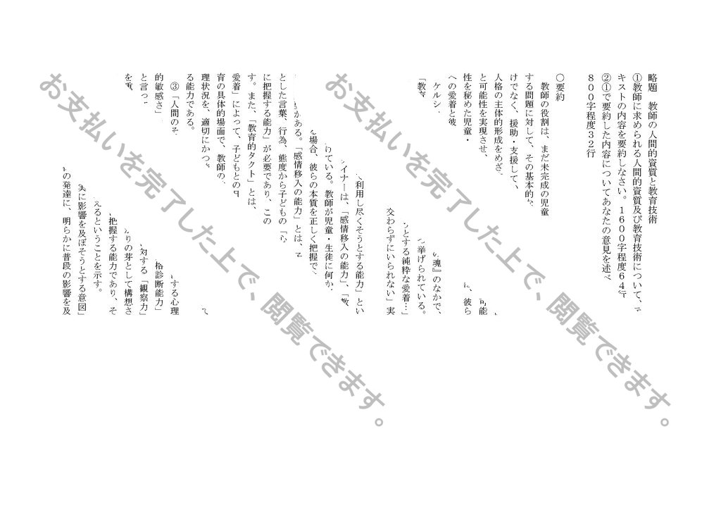 ①教師に求められる人間的資質及び教育技術について、テキストの内容を要約しなさい。1600字程度64行