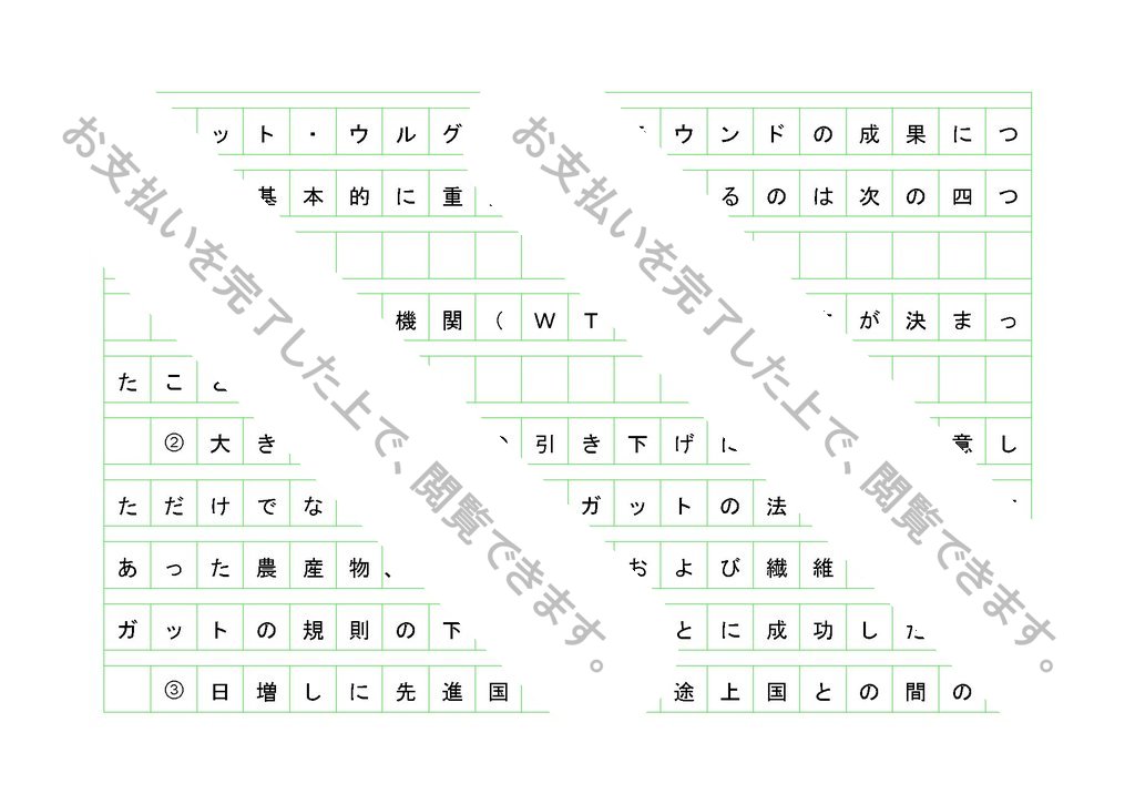 ガット・ウルグアイ・ラウンドの成果について、基本的に重要と思われるのは次の四つがある。①世界貿易機関(WTO)の設立が決まったこと。②大きな関税率の引き下げに各国が同意しただけでなく、従来はガットの法の規則外にあった農産物、サービスおよび繊維の貿易をガットの規則の下に置くことに成功したこと。③日増しに先進国と発展途上国との間の紛争の種となっている知的所有権について、より厳格な保護を定めている。④貿易が、自由であると同時に、公正であることを保証するために工夫された意義の深いルールを規定していること。以下に、四つの項目について詳しく述べていく。①の世界貿易機関の設立だが、ずっと続いていた「暫定的な」ガットによる変則的な体制が終了し、ウルグアイ・ラウンドの成果を実施し、今後の多角的交渉を通じて、世界貿易の一層の自由化を実現するための本格的な国際機関が誕生することを意味する。従来のガットは、法的に見れば、関税貿易一般協定を暫定的に適用する締約国の集団に過ぎなかったが、世界貿易機関となることにより、物品、サービスおよび知的所有権を包含し、共通の紛争処理手続きを持つ、永続的な国際的貿易機関として機...