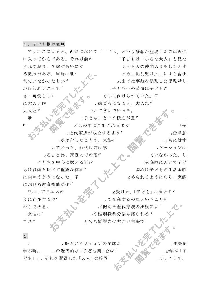 近代に入ると、ようやく「子ども」という概念が意識され始める。新たに家庭内で「愛らしさ」が子どもの中に見出されるようになり、これに伴って、「子ども」を中心に据えた近代家族が成立するようになる。「子ども期」の概念が意識され、子ども観が変化したことで、家族のあり方や家庭内での子どもに対する態度も変化していった。近代以前は感情交流や社会的コミュニケーションは家庭外にあるとさ...