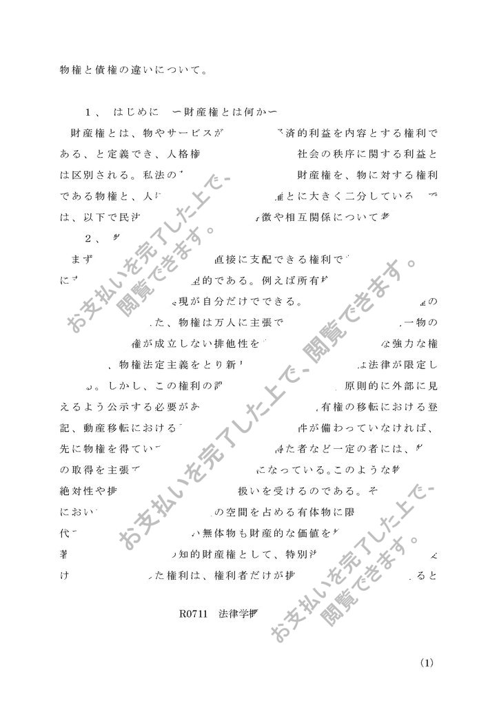 まず、物権は、特定の物を直接に支配できる権利であり、物を全面的に支配できる所有権が典型的である。例えば所有権を持つ者は、所有物の処分など、権利の実現が自分だけでできる。このような性質を物権の直接性という。また、物権は万人に主張できる絶対性を有し、同一物の上には他の物権が成立しない排他性をもつ。物権はこのような強力な権利なので、物権法定主義をとり新しい物権をつくることは法律が限定している。しかし、この権利の設定や移転については、原則的に外部に見えるよう公示する必要がある。例えば、不動産所有権の移転における登記、動産移転における引き渡しなどの対抗要件が備わっていなければ、先に物権を得ていても後から...