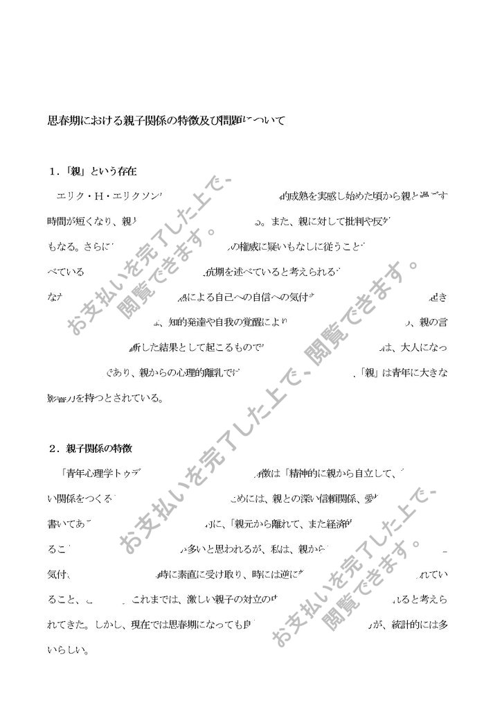 「青年心理学トゥデイ」によると、親子関係の特徴は「精神的に親から自立して、親との新しい関係をつくること」、また「心理的離乳のためには、親との深い信頼関係、愛情関係が必要」と書いてある。親からの...