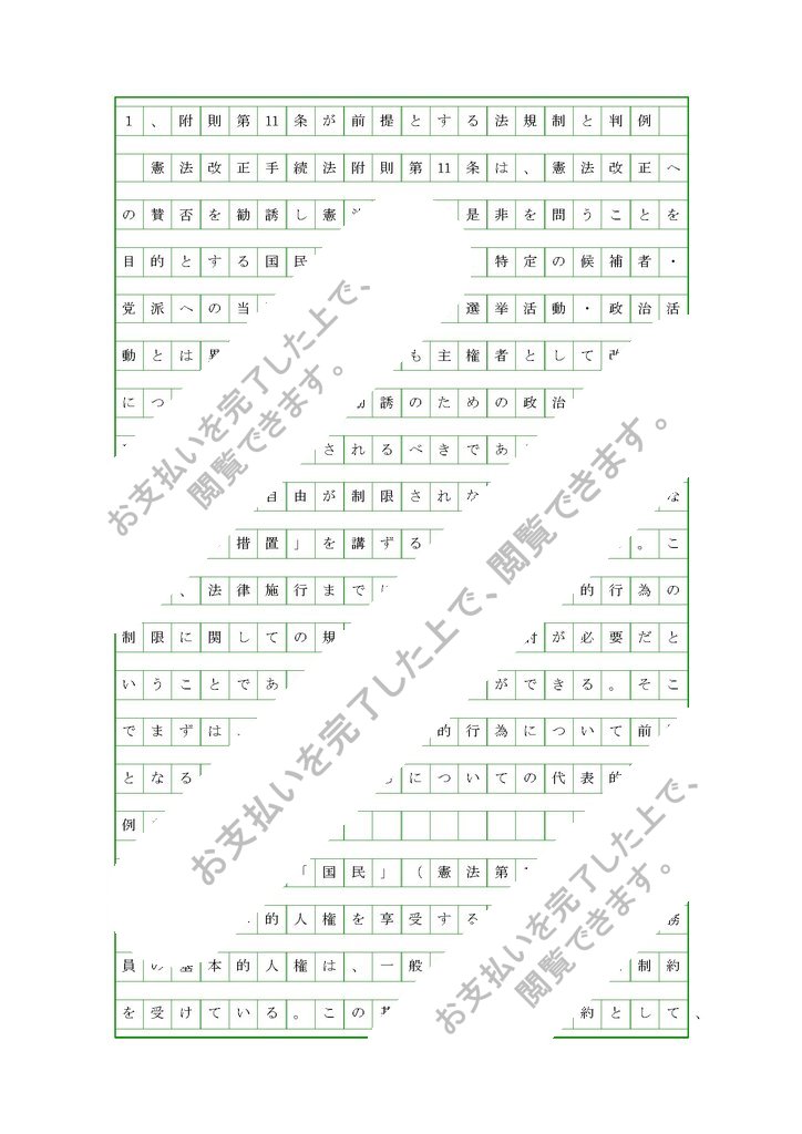 改憲法は、公務員の政治的行為の制限に関し、「規定について検討を加え、必要な法制上の措置を講ずる」(附則11条)と述べる。(1)判例の紹介・論評、(2)附則11条の趣旨を批判的に検討せよ。(2011年度第1課題、評価C)