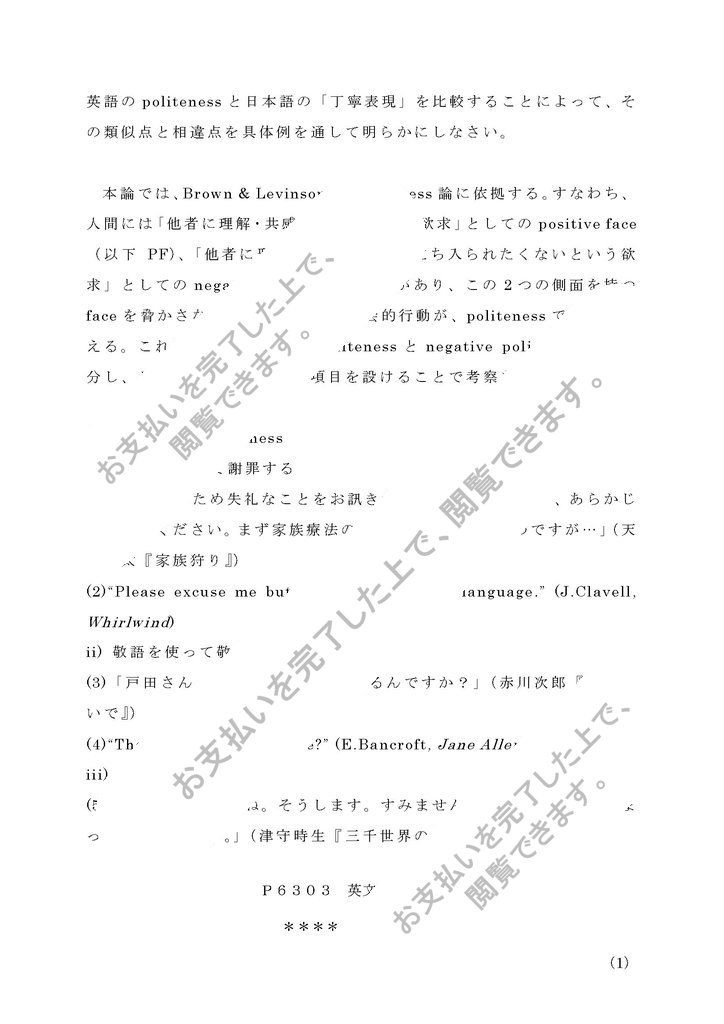 【設題】英語のpolitenessと日本語の「丁寧表現」を比較することによって、その類似点と相違点を具体例を通して明らかにしなさい。