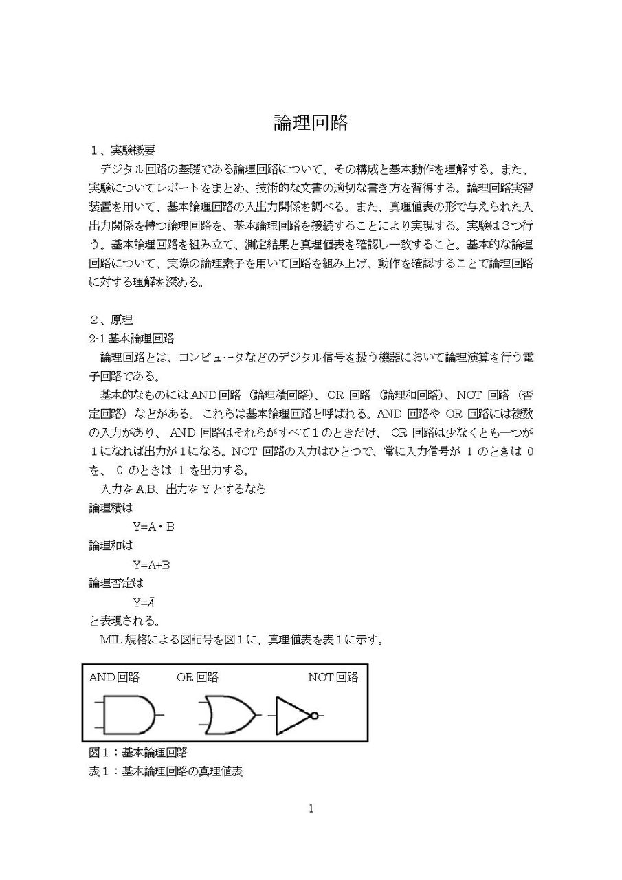 デジタル回路の基礎である論理回路について、その構成と基本動作を理解する。また、実験についてレポートをまとめ、技術的な文書の適切な書き方を習得する。論理回路実習装置を用いて、基本論理回路の入出力関係を調べる。また、真理値表の形で与えられた入出力関係を持つ論理回路を、基本論理回路を接続することにより実現する。実験は3つ行う。基本論理回路を組み立て、測定結果と真理値表を確認し一致すること。基本的な論理回路について、実際の論理素子を用いて回路を組み上げ、動作を確認することで論理回路に対する理解を深める。
