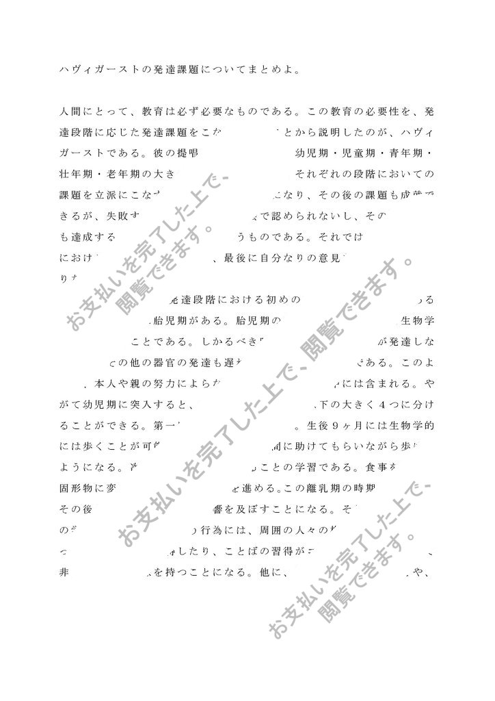 人間にとって、教育は必ず必要なものである。この教育の必要性を、発達段階に応じた発達課題をこなしていくことから説明したのが、ハヴィガーストである。彼の提唱する発達課題は、幼児期・児童期・青年期・壮年期・老年期の大きく5段階に分類され、それぞれの段階においての課題を立派にこなすことができれば幸福になり、その後の課題も成就できるが、失敗すれば、不幸になり社会で認められないし、その後の課題も達成することが困難になるというものである。それでは、各発達段階における特徴を考察しながら、最後に自分なりの意見を述べて締めくくりたい。
