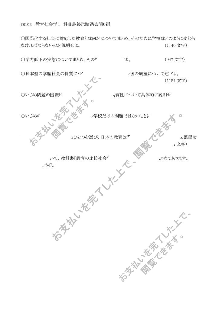 【S8103】【Z1104】教育社会学1科目最終試験過去問6題セットです。 主にテキストの内容をまとめたものです。