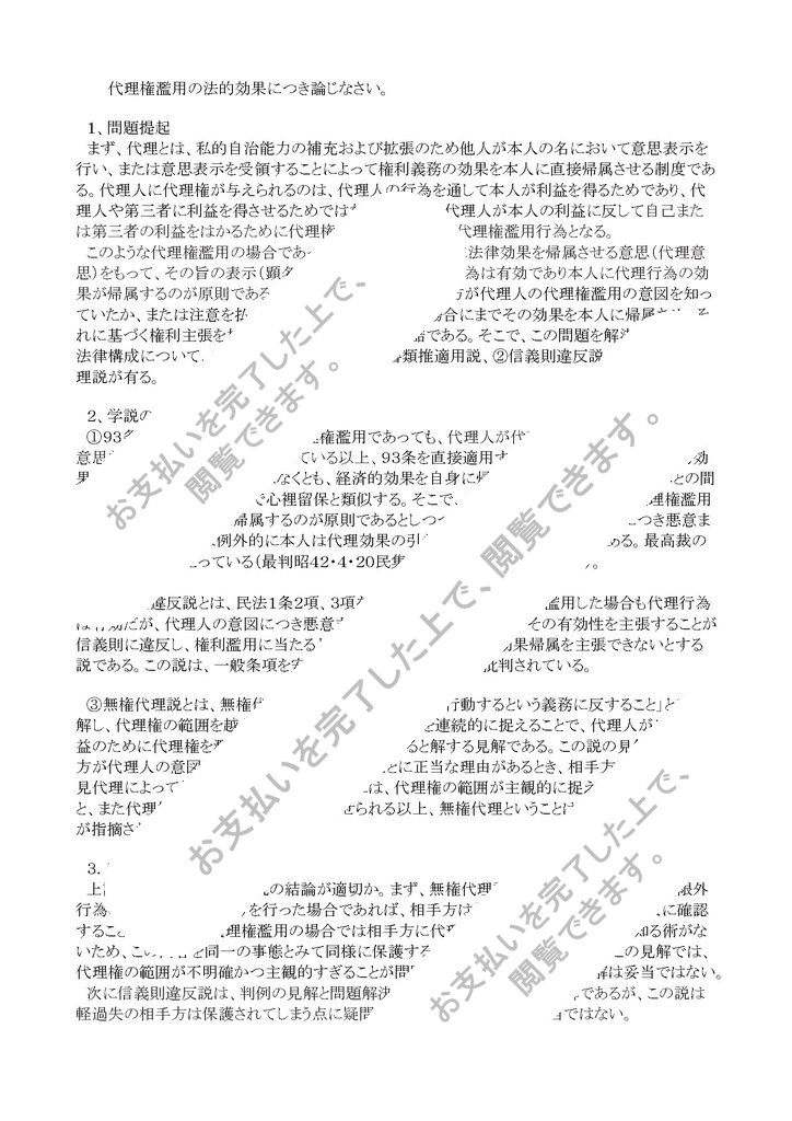 このような代理権濫用の場合であっても、代理人は本人に法律効果を帰属させる意思(代理意思)をもって、その旨の表示(顕名)をしている以上、代理行為は有効であり本人に代理行為の効果が帰属するのが原則である(民法99条)。しかし、相手方が代理人の代理権濫用の意図を知っていたか、または注意を払えば知ることができたような場合にまでその効果を本人に帰属させ、それに基づく権利主張を相手方に許すのは、本人に酷である。そこで、この問題を解決するための法律構成について、有権代理説から①93条但書類推適用説、②信義則違反説、また③無権代理説...