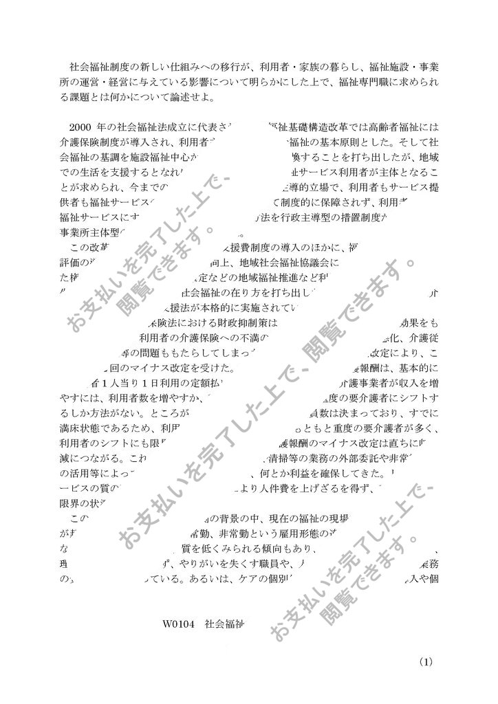 社会福祉方法原論第2設題,佛教大学、社会福祉制度の新しい仕組みへの移行が、利用者・家族の暮らし、福祉施設・事業所の運営・経営に与えている影響について明らかにした上で、福祉専門職に求められる課題とは何かについて論述せよ。 |