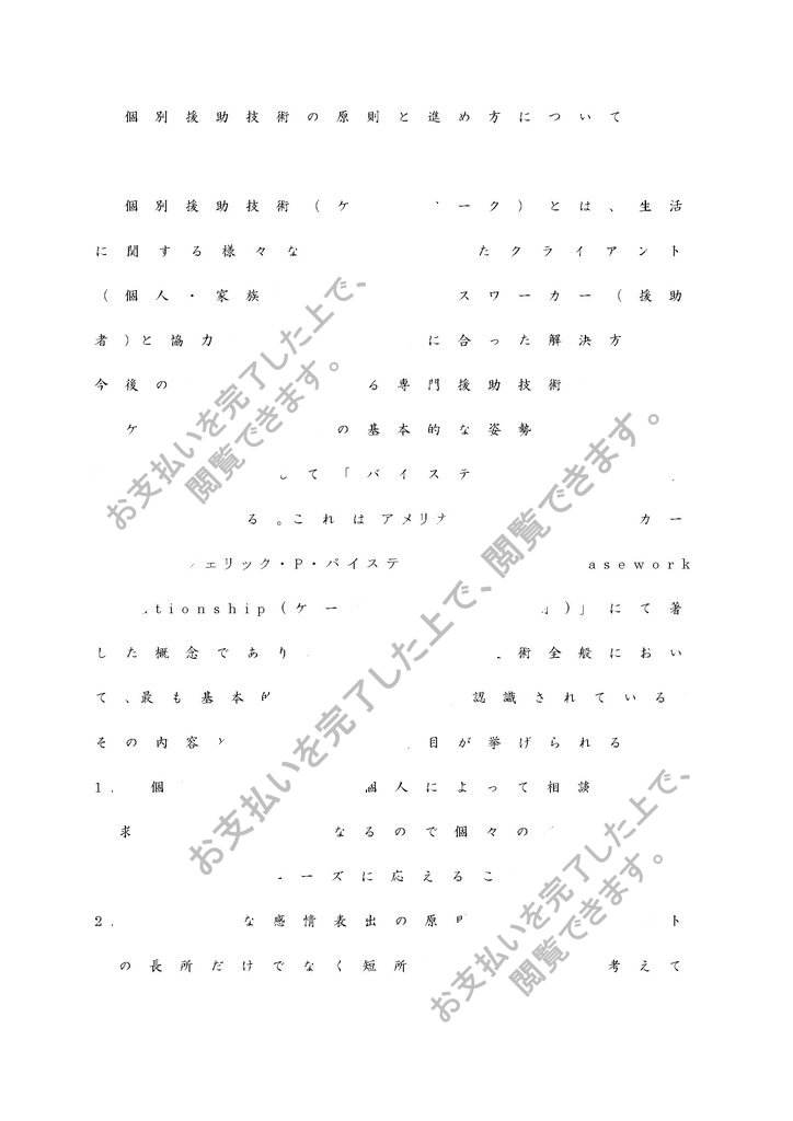 個別援助技術(ケースワーク)とは、生活に関する様々な問題を抱えたクライアント(個人・家族等)が、ケースワーカー(援助者)と協力し合い、ニーズに合った解決方法、今後の見通しを立てる専門援助技術である。