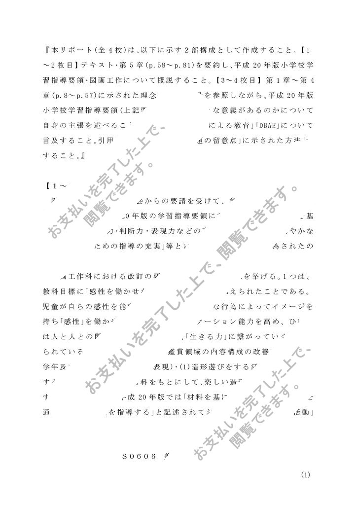 『本リポート(全4枚)は、以下に示す2部構成として作成すること。【1~2枚目】テキスト・第5章(p.58~p.81)を要約し、平成20年版小学校学習指導要領・図画工作について概説すること。【3~4枚目】第1章~第4章(p.8~p.57)に示された理念・歴史的背景を参照しながら、平成20年版小学校学習指導要領(上記要約)にはどのような意義があるのかについて自身の主張を述べること。その際、必ず「美術による教育」「DBAE」について言及すること。引用を行う場合は「第1設題の留意点」に示された方法とすること。』