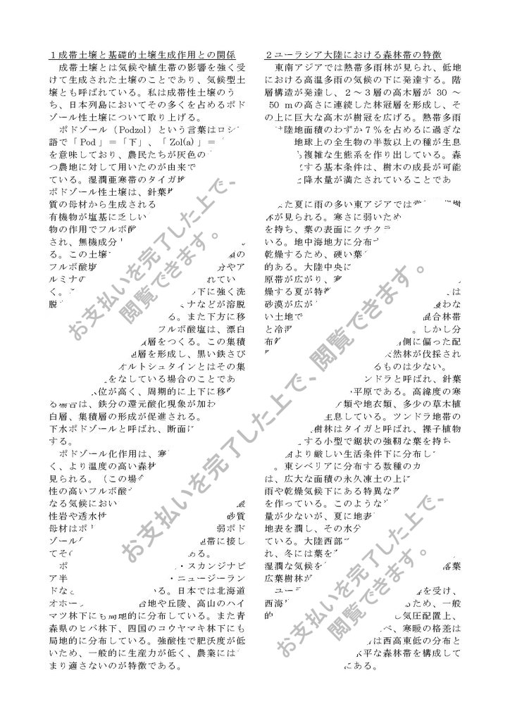 成帯土壌とは気候や植生帯の影響を強く受けて生成された土壌のことであり、気候型土壌とも呼ばれている。私は成帯性土壌のうち、日本列島においてその多くを占めるポドゾール性土壌について取り上げる。