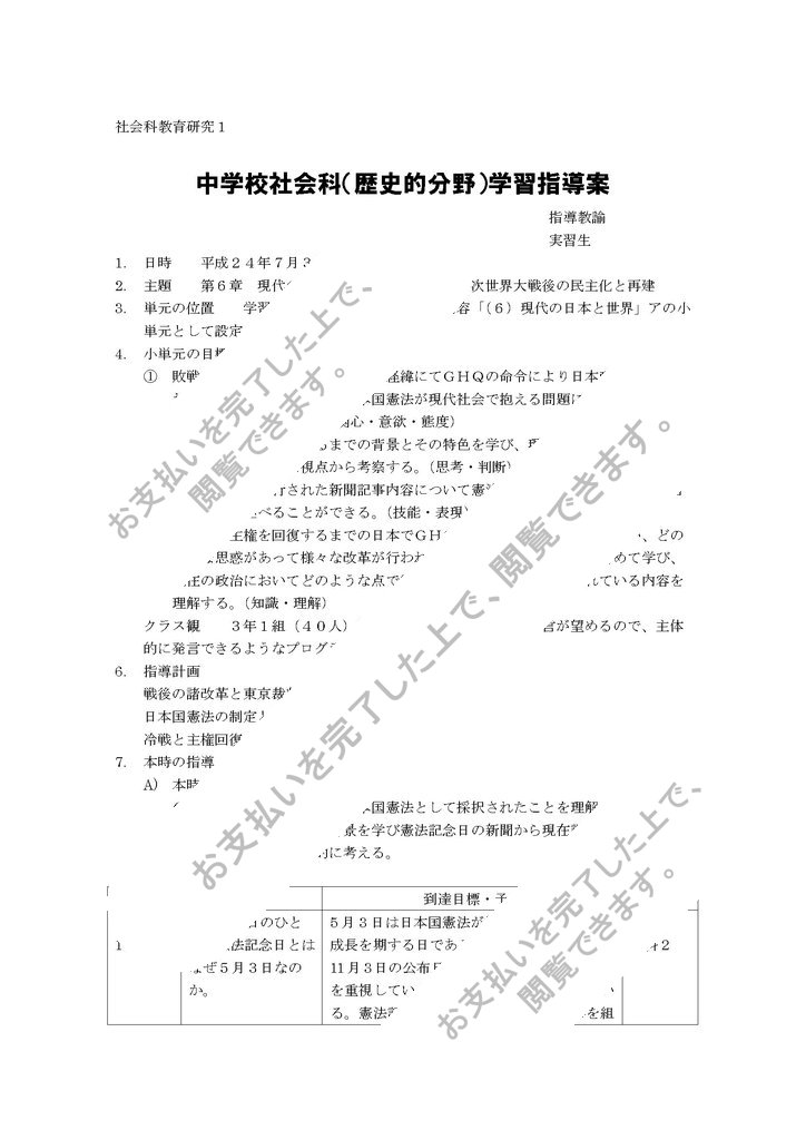 敗戦から日本の独立を回復までの経緯にてGHQの命令により日本政府の手で行われた諸改革の一部である日本国憲法が現代社会で抱える問題について意欲的に追及する態度を育てる。(関心・意欲・態度)