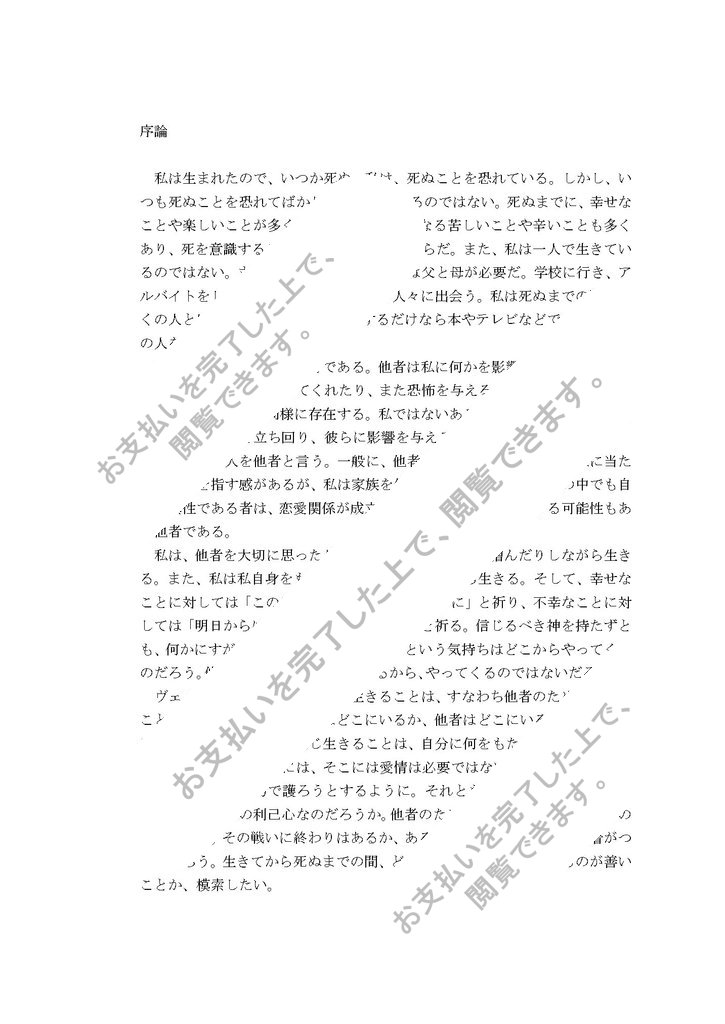 私は生まれたので、いつか死ぬ。私は、死ぬことを恐れている。しかし、いつも死ぬことを恐れてばかりして生きているのではない。死ぬまでに、幸せなことや楽しいことが多くあり、また死とは異なる苦しいことや辛いことも多くあり、死を意識することに集中していないからだ。また、私は一人で生きているのではない。まず、私が生まれるためには父と母が必要だ。学校に行き、アルバイトをし、成長し、更にたくさんの人々に出会う。私は死ぬまでの間に多くの人と出会うだろう、更に見聞きするだけなら本やテレビなどでもっと多くの人を知る。