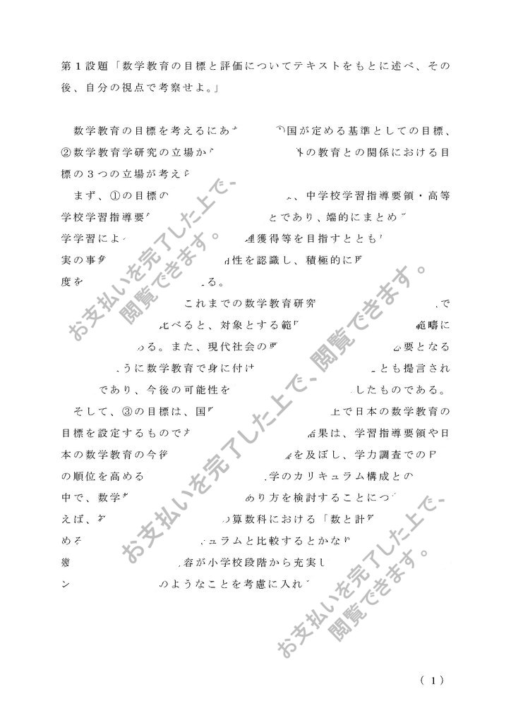 佛教大学通信教育課程、教科教育法数学1 第1設題「数学教育の目標と評価についてテキストをもとに述べ、その後、自分の視点で考察せよ。」の合格レポートです。